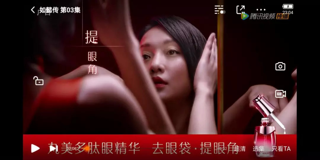 经历过这番轰炸,观众刚刚通过片头曲在歌声中陷入情绪,有了一点看剧心态,马上就会看到周迅的丸美眼精华广告,这段插入广告VIP会员也需要观看。