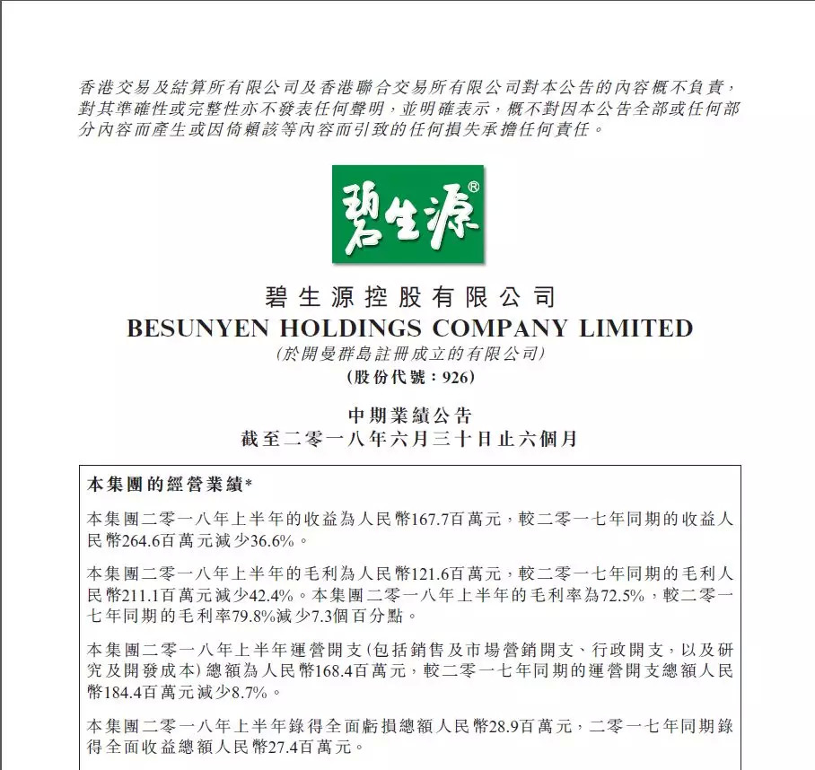 8月20日晚间,碧生源发布了2018年中期业绩公告,2018年上半年,实现收益约为1.677亿元,较2017年同期收益约为2.646元,减少36.6%;