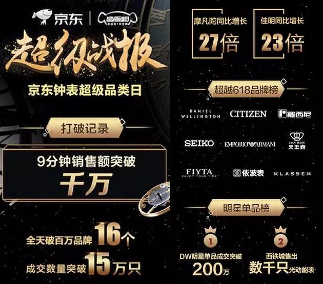 以线上钟表强势的京东为例,上周京东钟表超级品类日,0点刚过的9分钟,销售额突破千万,当天成交数量突破15万只,16家品牌销售额破百万,总销售额与去年同比增长超过600%,其中西铁城、罗西尼、精工、飞亚达等品牌的销售都超过了今年的618。国产表总销售额比去年同比增长近300%。