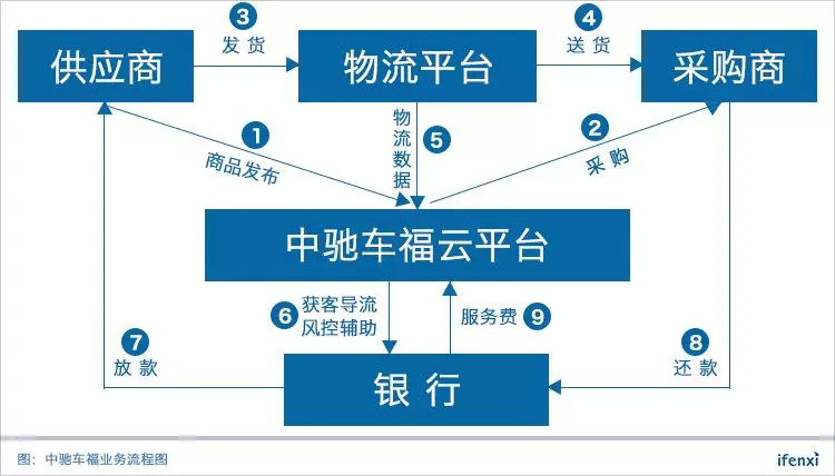 在交易场景中,中驰车福提供线上供应链金融产品,帮助银行进行风险控制、提供潜在借贷客户,同时根据平台积累的交易数据和物流数据对企业授信,由银行按交易订单进行贷款审批、贷款发放和风控管理。