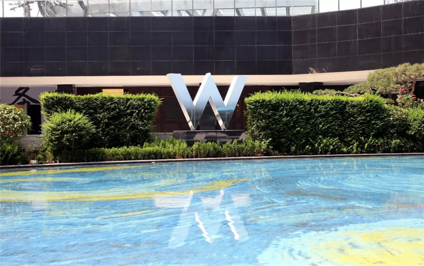 而户外更是有亮眼的W品牌LOGO,以及画家梵高的《星月夜》油画泳池底;遮阳伞上,则印制着雍容的唐代美女。