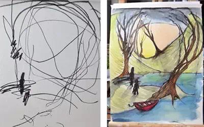 ▶等到女儿能画出比较连贯的线条和大致轮廓时,Ruth了解了她的作画意图后在原画的构架上施以水彩,试图还原女儿眼中的世界,第一幅合作作品《红船》就这么完成了。