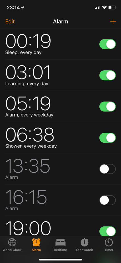 对,你没有看错,是少睡 3 小时。白天冷落手机、回微信都分秒必争的 Kim,到了午夜却把手机当成了并肩作战的「队友」:过去大半年他坚持每晚只睡三四个小时,手机设满了闹铃;身边老婆孩子早已熟睡,他却一边起床看书,一边用耳机听节奏很燃的滨崎步 live 保持清醒。