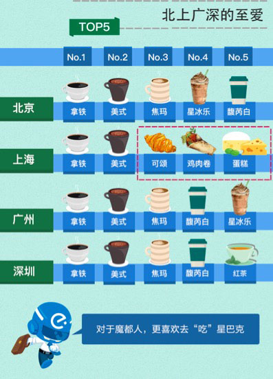 在一般人看来,星巴克最常见的消费场景是下午茶,而饿了么数据显示,上海竟有21.4%的星巴克外卖订单来自早晨!同时上海人民在晚餐期间也要喝一杯星巴克的比例也是一线城市中最高的,为11.3%。下午茶时段占比最高的一线城市是深圳,为36%。
