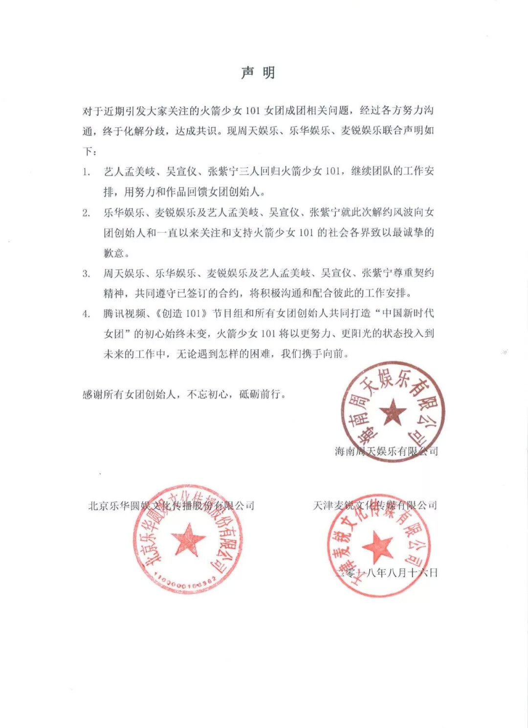 8月17日,恰逢七夕节,周天娱乐、乐华娱乐和麦锐娱乐的共同声明,孟美岐、吴宣仪、张紫宁将归队,火箭少女101的经纪纠纷暂时告一段落。