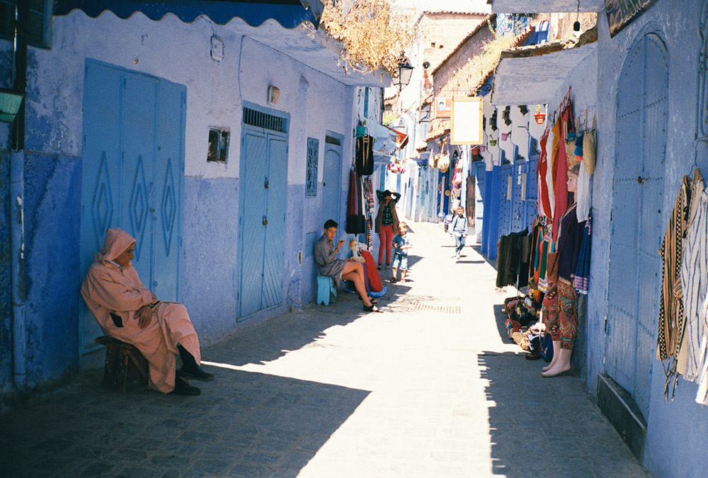 盘山,多云,一片蓝白色的房子停在半山腰,是童话般的舍夫沙万,它比我想象中更小,更静。在这里居住的村民几乎都是身穿长袍的柏柏尔人,又以老人和孩子居多,当然,猫依旧是抢眼的主角。真的仿佛置身《一千零一夜》里,虽然接近夏日,人们依旧用尖帽长袍将自己包裹起来。