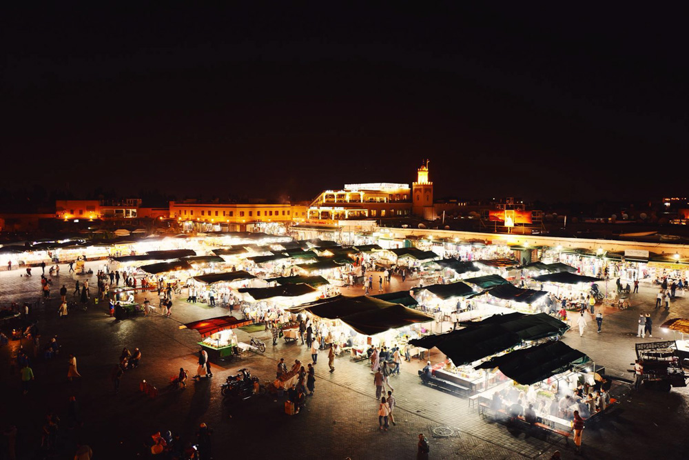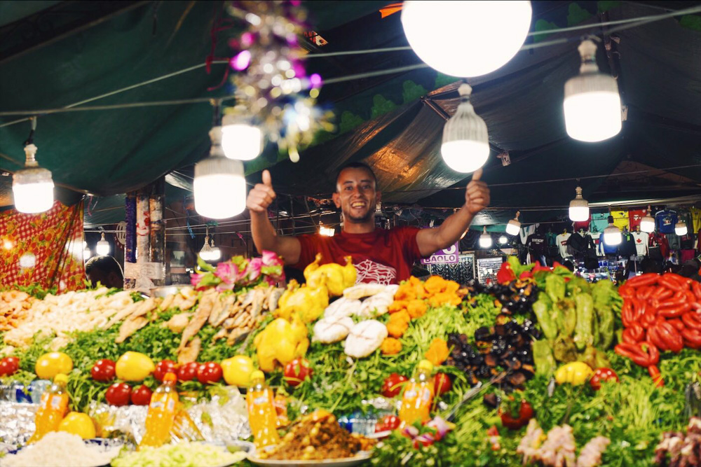踩着夕阳,我们走出庭院,路过清真寺,灯逐渐亮了起来,一个个标着号码的摊档纷纷铺开,烧烤、坚果、水果、海鲜、塔吉锅、蜗牛、海娜纹身、拖鞋、皮包、灯具、地毯……因为每家拉客的套路都如出一辙:小哥们纷纷唱起了夏奇拉(Shakira)为2010年南非世界杯所唱的主题曲《Waka Waka》的副歌,拉赢了的摊主击掌庆祝。