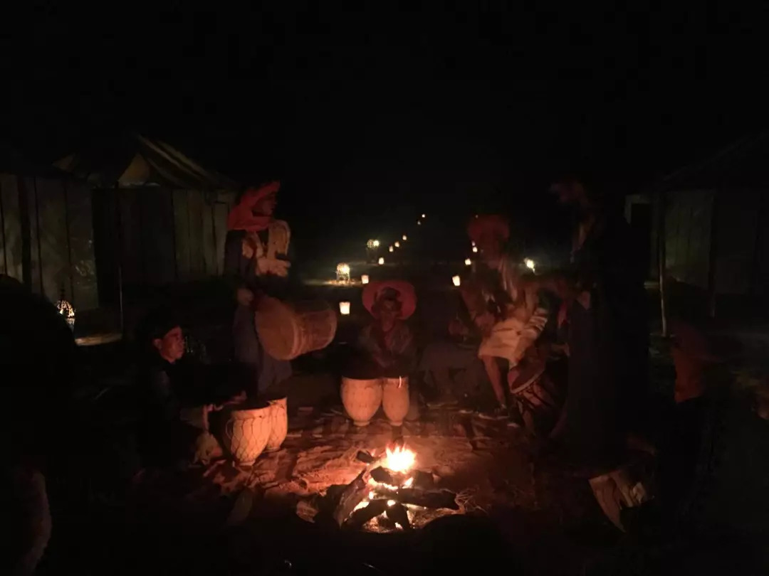 我们从瓦尔扎扎特出发,终于在下午四点半赶到了梅尔祖卡。等待其他驼队成员到来一同进沙漠的同时,驿站的领队给我们斟上了薄荷茶。薄荷茶分加糖和无糖,饮用之前店家都会询问客人的嗜好。我喝过最好喝的薄荷茶是在耶路撒冷,野生的薄荷叶在冷水中张牙舞爪,入喉有辛辣的清凉,也有沁脾的爽快。不像在摩洛哥,都是热泡。周遭温度本就偏高,快落山的太阳照在皮肤上有微辣的灼烧感,薄荷叶在滚烫的沸水中像蔫了的芭蕉,还未出征就泄了气。只好依靠其中的糖分给我一些能量。
