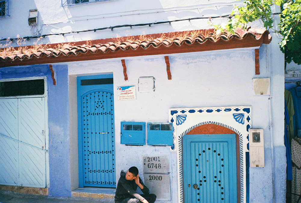 舍夫沙万的蓝,由深入浅,海蓝,天蓝,宝石蓝,雾霾蓝,马卡龙蓝……比圣托里尼岛更加蓝得纯粹。这里的门也千奇百怪,垂下的手,黑色的图钉,弧形,圆形,方形,平行线,三角形……好似拥有任意门, 往右一个转弯,往上一段石阶,都能通往不同的时空。
