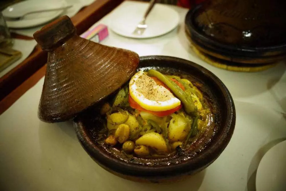 塔吉锅产于摩洛哥,高盖帽,陶土材料制成,因为透气不透水,加上三角圆锥的造型使得蒸气循环上升,能够最大限度地减少水分丧失。在烹饪过程中只需少量水,水汽均匀地滴落在食材上,最大程度地保持食物的原汁原味和营养;牛肉、鸡肉、鱼,配上茄子、土豆等蔬菜,构成了当地主食,再配以小米饭,就是“北非黄焖鸡米饭”了。