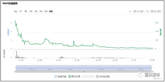 截止8月20日15时,全民链WAC自今年1月12日以0.0648美元的价格上线交易平台以来,跌幅已经达到了97%,报0.0131元人民币,24小时成交额也仅有10.34万元人民币。