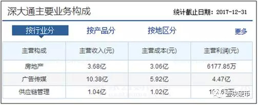 其2017年12月31日年报显示,深大通主要业务构成为房地产、广告传媒、供应链管理这三大板块,其中广告传媒板块贡献收入、利润均为最高,分别为10.38亿元、4.47亿元。