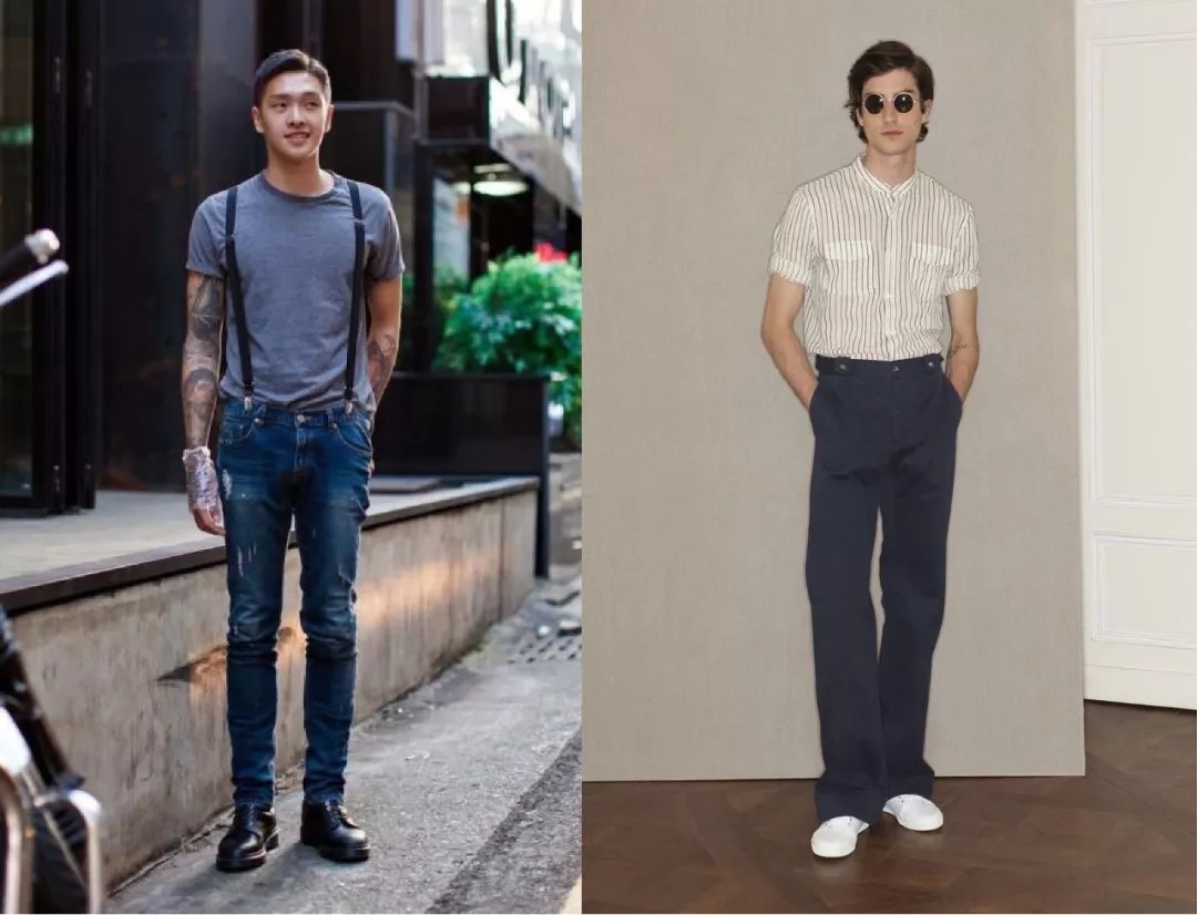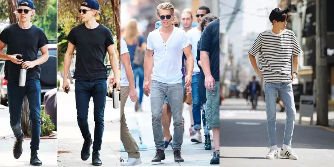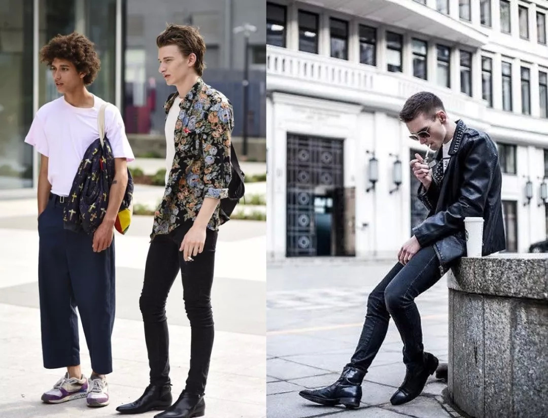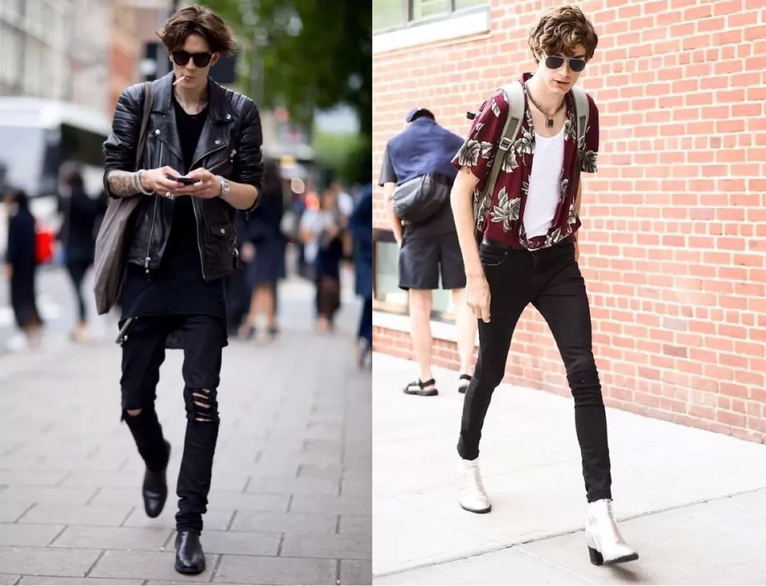 下面图中两人的身高差不多,但明显右边窄身长裤搭配同色尖头靴的那位穿搭上更加赏心悦目,整体上更加引人瞩目,更符合大部分妹子心中“长腿欧巴”的形象。