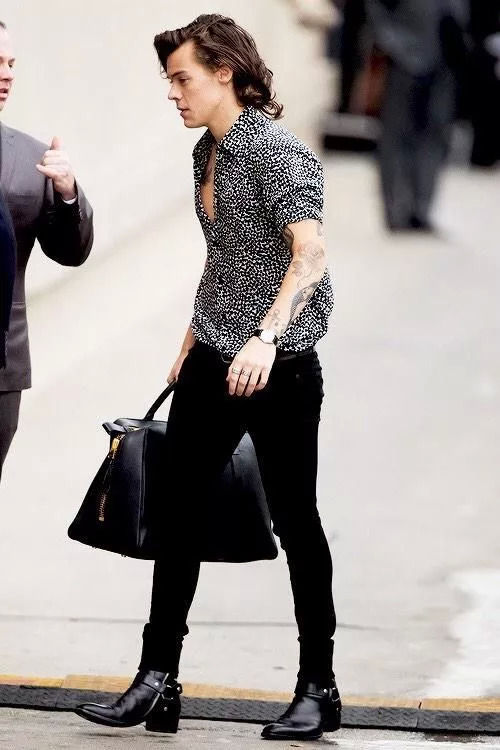 Harry style也经常采用这种窄身长裤配同色尖头靴的穿法。