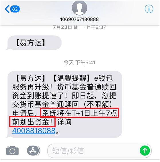 近日,易方达基金通过短信的方式告知客户,客户通过直销平台易钱包提交的货币基金普通赎回申请,系统将在T+1日上午7点前划出资金。