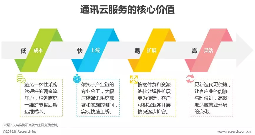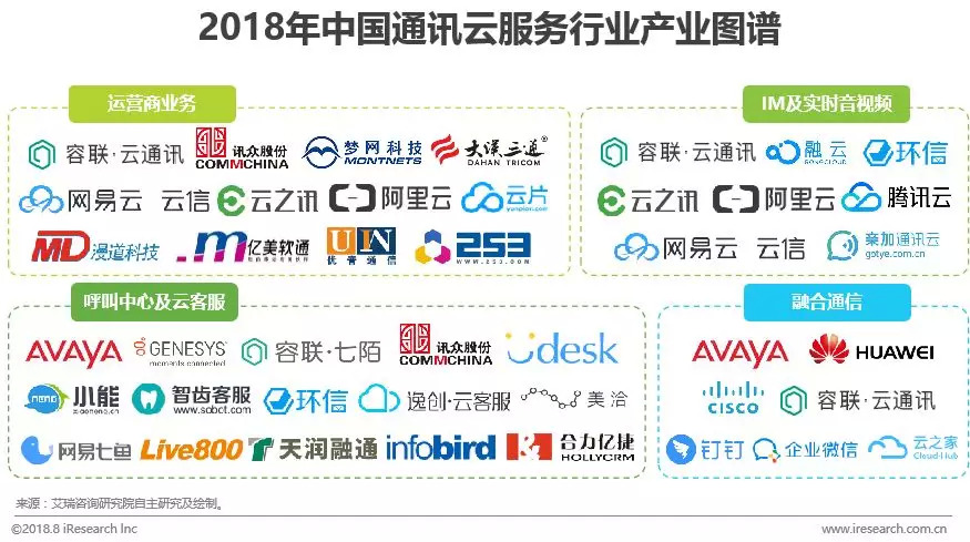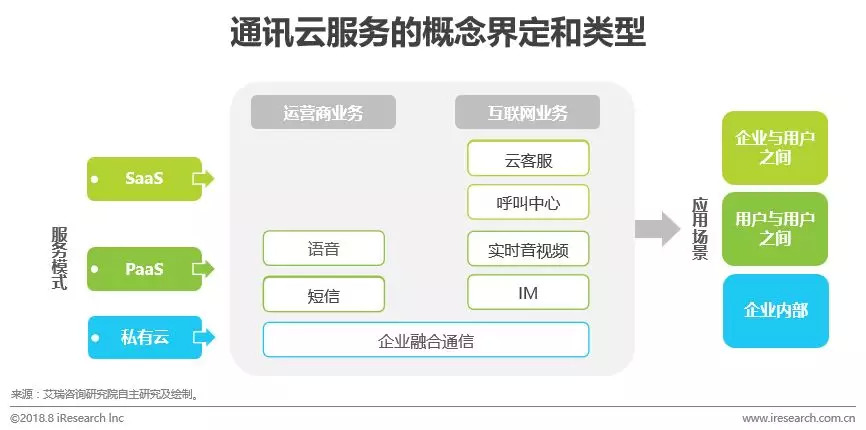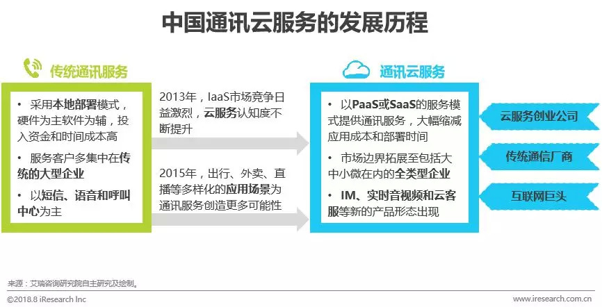 企业通信服务早期以短信、语音和呼叫中心为主,采用本地部署的模式提供给传统的大型企业。随着阿里云、腾讯云等巨头公司相继进入公有云IaaS市场,企业客户对云服务的认知程度逐渐提高,在通讯垂直领域中不断出现新兴的云服务创业公司。移动互联网时代,多样化的应用场景让互联网公司和中小企业对通讯服务的需求也变得越来越强烈,无论大中小微企业都能从低成本高效率的云服务中受益。通讯云服务在将市场边界拓展至各类型企业的同时,产品形态也由基于运营商的业务向IM、实时音视频和云客服等延伸。传统通信厂商和互联网巨头纷纷利用自身优势切入这一市场,通讯云服务对传统通讯服务的替代作用日益明显。
