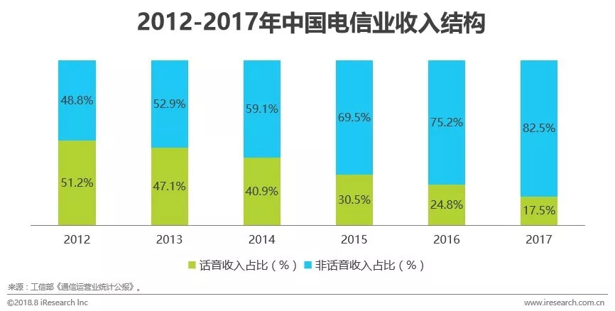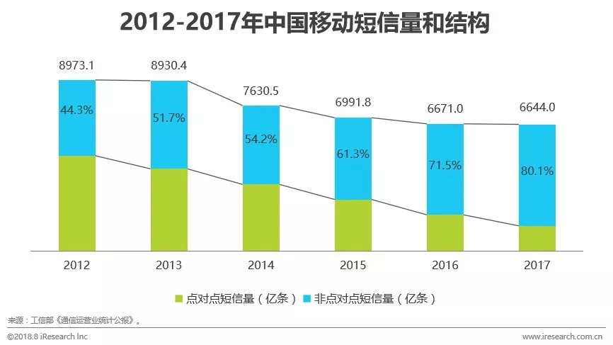 移动互联网和社交媒体的兴起不断冲击着传统电信领域,短信和语音业务面临着萎缩态势。工信部《通信运营业统计公报》数据显示,2017年,语音收入对电信业的收入贡献跌至17.5%,互联网业务对运营商管道业务的替代作用明显。移动用户主动发起的点对点短信量占比持续下降,由2012年的55.7%下降到2017年的19.9%。尽管移动短信量整体表现下滑,但以企业级应用为主的非点对点短信却自2015年起逆势上涨,2017年非点对点短信年增长率达到11.6%。可以见得,企业级通信已然成为传统通信业务的重心。