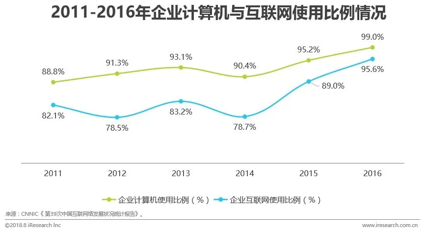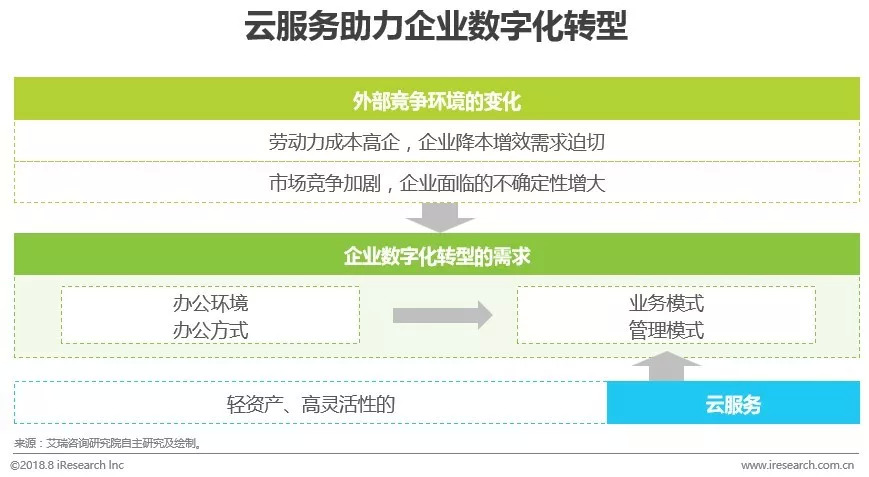 根据CNNIC数据,2016年我国企业使用计算机和互联网的比例分别为99.0%和95.6%。互联网全面普及的背后是我国企业数字化转型开始逐步迈向深水区,变革已经不再局限于办公环境和方式的层面,更重要的是企业业务模式和管理模式的数字化。后人口红利时代,劳动力成本持续增加;竞争环境日渐严峻,快速响应市场的能力愈发重要。在这样的背景下,云服务被视为数字化转型的关键环节,越来越多的企业选择将自身业务与轻资产、高灵活性的云服务结合在一起。