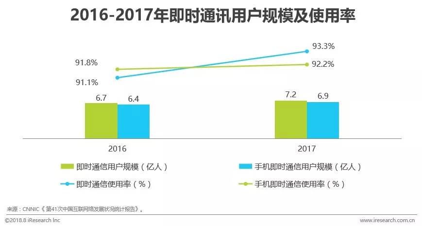 2017年,即时通信用户规模达到7.0亿人,占整体网民的比例增长至93.3%。受到C端用户习惯变化的影响,新兴的通信方式不断从个人通信领域向企业级通信渗透。在传统的短信和语音之外,通讯云服务已经发展出IM、实时音视频、云客服等多样化的产品形态,并可以基于不同的应用场景满足个性化和差异化的通讯需求。