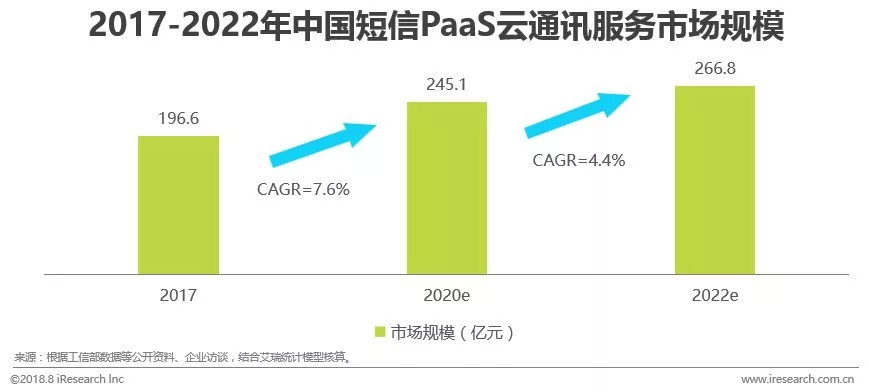 国内短信云通讯市场在2017年规模为196.6亿元,随着各类互联网服务的发展,短信验证码和信息通知类服务的应用继续增加,至2020年将以7.6%的年复合增长率增长至245.1亿元。2020年之后,短信的通知形式受到达率和用户使用习惯影响,将一定程度上被语音和IM取代,增速有所放缓,预计至2022年市场规模为266.8亿元。