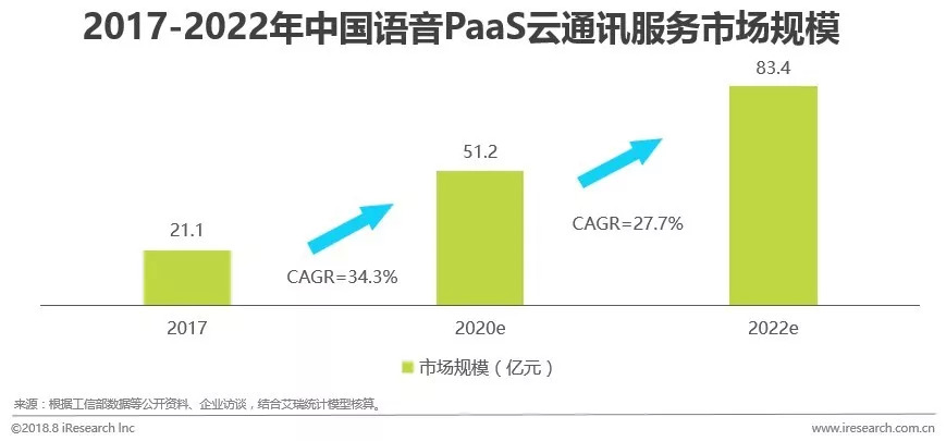 语音云通讯市场的起步稍晚,2017年的市场规模为21.1亿元,与短信市场的差距较大。但随着应用内的隐号通话、语音验证码、语音通知等服务场景日益成熟,市场将保持20%以上的高速增长,预计至2022年市场规模为83.4亿元。