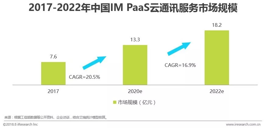 当前国内PaaS层的IM云服务市场规模为7.6亿元,且受到移动社交、短视频、社交电商等互联网新兴行业的发展利好,在近三年将保持20.5%的年复合增长率,预计至2020年市场规模为13.3亿元。IM PaaS服务多依赖于互联网创业公司的发展浪潮,预计2020年之后市场增速将略微放缓,年复合增长率为16.9%,至2022年市场规模将达到18.2亿元。