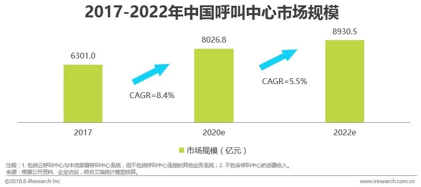 呼叫中心在国内发展起步较早,市场培育相对成熟,市场体量也十分庞大,2017年国内整体呼叫中心(含云端部署与本地部署)的市场规模为6301.0亿元。由于基数大且市场相对稳定,呼叫中心市场的年复合增长率为8.4%,且在2020年后预计年复合增长率为5.5%。不过,呼叫中心系统正在经历本地部署到云端部署的迁移,目前云呼叫中心已经占据增量市场的绝大部分。