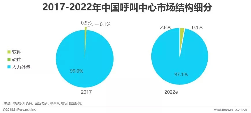 从市场细分结构来看,人力外包是呼叫中心产业的最大收入,占比为99.0%。随着系统加速云化和智能化,AI对呼叫中心的持续改造加速了软件部分的营收增长;而与此同时,硬件市场日渐衰微,在整体市场中的占比已不足0.1%。