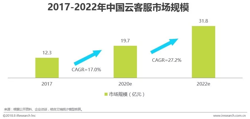 2017年国内云客服市场的规模为12.3亿元,并将以17.0%的年复合增长率至2020年达到19.7亿元规模。得益于AI技术与客服领域的紧密结合,云客服市场未来的想象空间更加广阔,2020年后预计年复合增长率将进一步加快至27.2%。