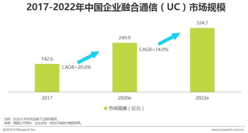 企业融合通信(或统一通信/UC)市场前期以IT硬件厂商为主导,随着企业上云步伐加快,新型融合通信厂商拉动UC市场转型与进一步发展,预计市场规模将从2017年的142.6亿元上升至2020年的249.9亿元。