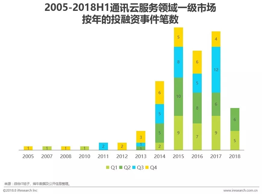梳理通讯云服务领域历年在一级市场的投融资数据,2013年之前仅有零星几笔融资事件,且主要集中于客服和呼叫中心领域。从2013年下半年开始,资本热度明显上升,并在随后的2015-2017年维持了较高的投资热情。这一方面是由于2013年左右“云服务”概念的兴起与普及,推动了其下“云通讯”市场的创业与投资热度提升;另一方面也得益于整体互联网行业近几年的发展热潮,通讯云服务的应用场景不断扩展,市场需求得到快速释放,更受资本市场关注。