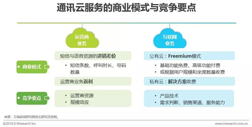 通讯云服务商针对运营商业务和互联网业务分别采取两种不同的商业模式。运营商业务的核心在于整合运营商资源,通过短信与语音的进销差价实现盈利,因此厂商间最关键的竞争要素在于能否掌握质优价廉的运营商资源,而规模效应能够帮助厂商在这种薄利多销的模式下获利更多。