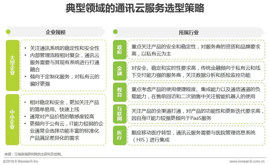 受到客户的企业规模与所属行业的影响,不同类型的客户对通讯云服务的稳定性、安全性、可扩展性、功能性以及部署模式等存在着不同的倾向,客户需要结合自身的IT能力和成本预算等选择合适的服务商。通讯云服务商在细分领域的经验和案例同样是客户选择的重要考量。