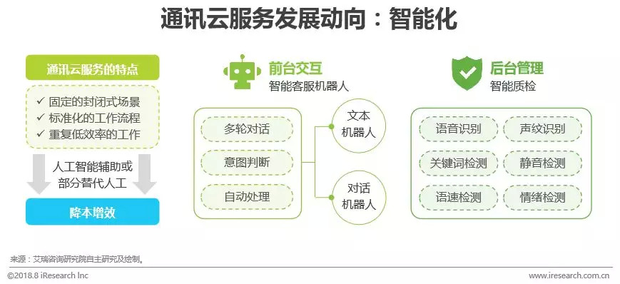智能客服机器人是目前行业内热度最高的领域,利用根据行业知识和企业业务搭建的知识库,不断通过深度学习进行知识库的自动维护和优化。文本机器人和对话机器人已经能够实现较为平滑流畅的交互体验,在金融、教育、快消等强客服需求的行业中已经落地应用。除前台面向用户的服务外,人工智能技术同样被运用在通讯云服务的后台管理中。其中智能质检为典型的应用方向,以机器的实时全检代替传统的人工抽检,可以解决抽检覆盖率低、检验标准存在差异、非实时被动响应等问题。