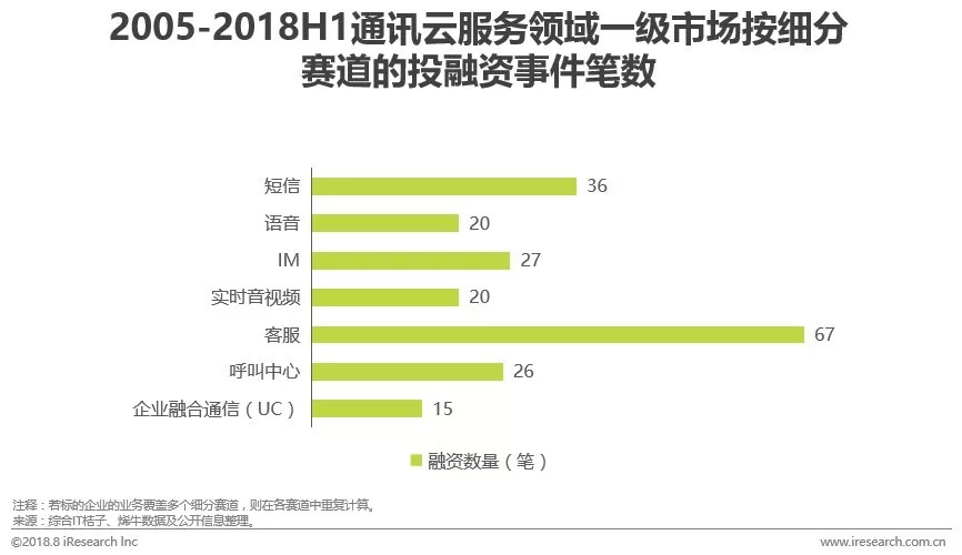 除此之外,传统的运营商资源领域,近一两年的资本热度稍显疲软,少数进行短信和语音创新型服务的厂商受到资本关注。呼叫中心市场尽管有大型寡头垄断,但市场容量依然巨大,也持续吸引资本关注。UC领域正在经历从传统硬件与IT厂商主导到互联网云厂商颠覆的变革期,投资人观望态度明显。