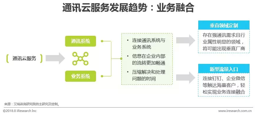 随着通讯云服务市场的进一步成熟,与企业客户的业务系统打通将是新的发展方向。业务融合的优势在于通过破除通讯系统与业务系统之间存在的信息孤岛,能够加速信息在企业内部的流转,从而压缩解决和处理问题的时间。越来越多的大型企业开始应用云服务来实现企业级通信,通讯云服务商往往需要与客户原有的各个系统融合,根据其实际应用场景做出个性化定制。