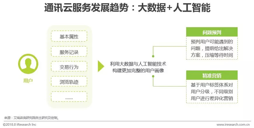 在过去割裂的通讯体系当中,用户的数据通常会分散在各个不同的部门里的,而随着通讯云服务不断走向融合,统一的用户资料管理将可以帮助企业形成更加完整的用户画像。将用户基本属性、交易行为、浏览轨迹等资料与呼叫中心和在线客服系统中的服务记录进行整合,利用大数据和人工智能技术进行数据挖掘和分析,不仅能够对用户遇到的问题进行预判,提前给出解决方案,更可以基于用户画像建立标签体系对用户进行分级,通过精准营销为企业的营收带来直接的贡献。