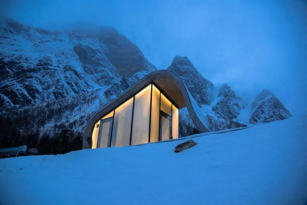 奥斯陆建筑工作室 HZA 在挪威风景如画的海岸边建造了一座休息室——Ureddplassen Rest Stop。它以一种柔和的姿态出现,包含休息室、卫生间,以及一路延展的观景广场,最终平稳的曲线融合于峡湾顶端,俯瞰挪威海和白雪皑皑的山脉,冬季能在这里欣赏北极光。