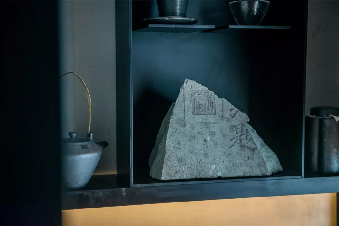 如果你是有心人,在此可以随处可见一些历史的碎片,点缀在房间中。摆件绝不只是摆设,每一件、每一处都各有讲究,无论是墙上陈列的各色茶具,还是坐镇前方的断垣,都是对杭州茶文化以及中国古代建筑史的收藏与致敬。