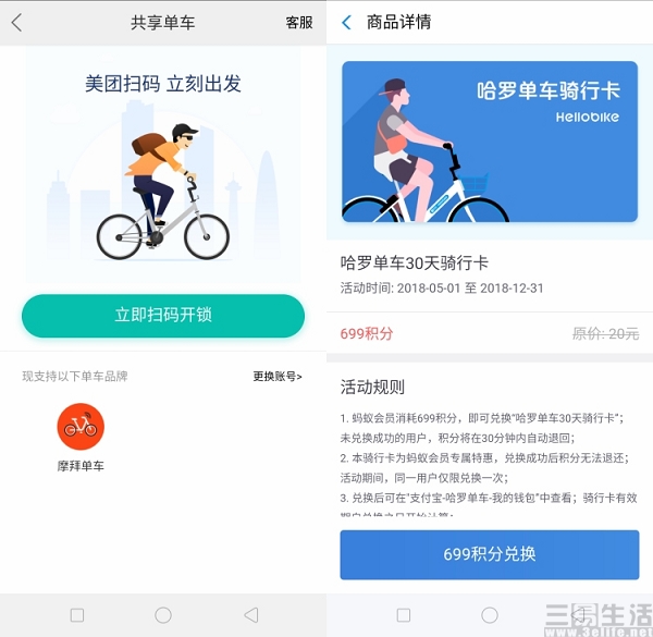 至于哈罗单车就更不用提了,在去年共享单车寒冬之际接收到来自蚂蚁金服的连续两笔融资之后,其后单车服务与蚂蚁金服进行了更深度的融合,不仅迅速与芝麻信用绑定,开启了免押之旅,随后又在月卡补贴上进一步与蚂蚁会员积分融合,推出了699积分免费换哈罗单车30天骑行卡的活动。