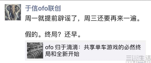至于小黄车这边嘛,已经不记得是多少次传出“ofo被收购”的消息了,甚至就在今天下午四点,从云财经处又爆出了"ofo最终‘卖身’滴滴的协议已经达成,公司作价20亿美元左右”这样的消息。而ofo的联合创始人于信也不厌其烦地不断辟谣,“周一就提前辟谣了,周三呢还要再来一遍。假的。终局?还早”。