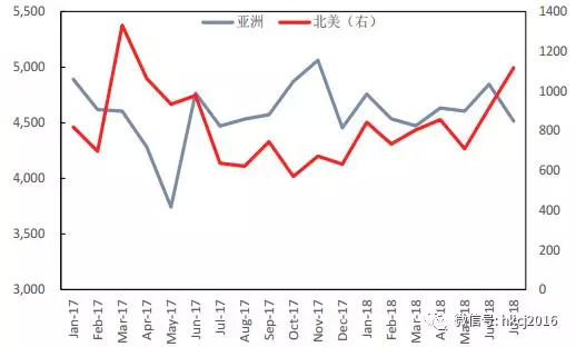 图3:沙特出口至亚洲和北美的原油量(千桶/日)(EIA,信达证券研发中心)