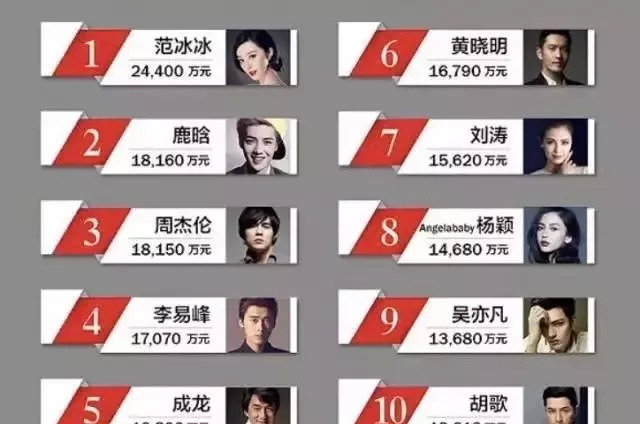 还记得崔永元在微博中曾经晒出范冰冰与某影视公司签约的合同照片,披露出范冰冰演出的工作酬金为1000万元。消息一出,引来网友议论纷纷。这件事情其实只是娱乐圈的冰山一角,明星报酬高达千万并非个案。根据相关报道显示,杨幂、孙俪、章子怡、白百合、杨颖、汤唯等艺人的市场片酬都能达到8000万+。另外,根据《2017年中国名人收入排行榜》数据,收入过亿的明星有14位,其中范冰冰以2亿4400万排名第一,鹿晗以1亿8160万位居第二,周杰伦1亿8150万排名第三。