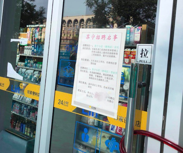 此前也有传闻称苏宁小店属意于邻家便利。界面新闻发现,在北京安定门一家已经关闭的邻家便利玻璃门上,贴着苏宁小店的招聘信息,招聘人员称苏宁小店在海淀和朝阳转租了部分邻家的门店,并希望招聘从邻家离职的员工,对面试时间也要求“越快越好”。