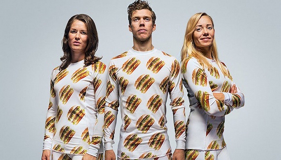 “枕头帽子”、“汉堡味和辣椒味的卫衣”、“续命水饰品”、“薯条印花外套”“外卖单衣服和塑料购物袋”、“能吃是福卫衣”、“旧编织袋的米袋腰包”……吃货气息扑面而来。设计上体现了食物和饿了么的品牌元素,比如大片的肉、鱼、薯条印花,还有外卖账单、塑料袋的图案。