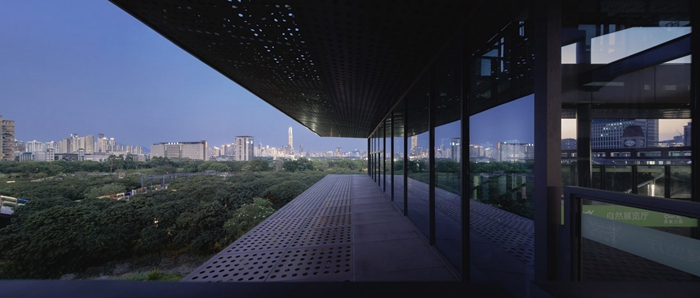 由MLA+建筑工作室为这座图书馆设计的悬挑金属屋顶建筑,起到为玻璃幕墙遮阴的作用,并通过一道长长的树梢走道与公园相连。香蜜公园最初用作农业研究中心,但在上世纪80年代被这个迅速扩张的城市“吞没”。