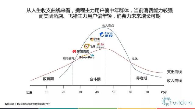 还是在Trustdata的报告里,一张综合性质的曲线图被展示出来,抓住商旅需求成长起来的携程牢牢的把持着了位于收入高点的用户群体,而美团和飞猪这些「后辈」,则从低点开始盘踞那些正值奋斗早期的新兴青年。
