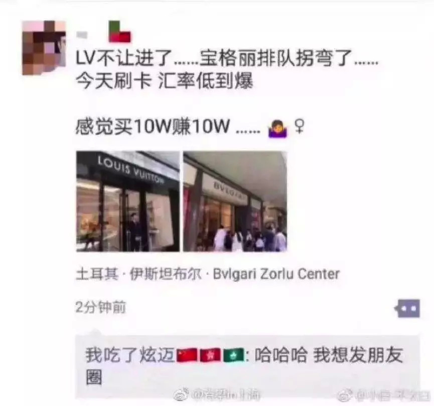 8月11日,有网友在朋友圈发出一张在伊期坦布尔的LV、宝格丽店购物的照片,并配文称:“LV不让进了,宝格丽排队拐弯了。今天刷卡,汇率低到爆。”