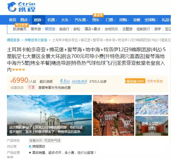 此前虽然也有有关人士分析认为:国内旅行社的产品是提前采购定价,土耳其货币贬值短期内对旅游报价应该影响不大。但事实上,从国庆、特别是11月开始,受机票和酒店价格下跌影响,土耳其旅游产品价格均有大幅下降,同比夏季价格优惠20%-30%,性价比很高。目前携程预售11月土耳其全景大环游12天产品价格只要6990元起,暑期在9000元左右。土耳其10日游当地参团产品的价格更是仅在3000元左右。