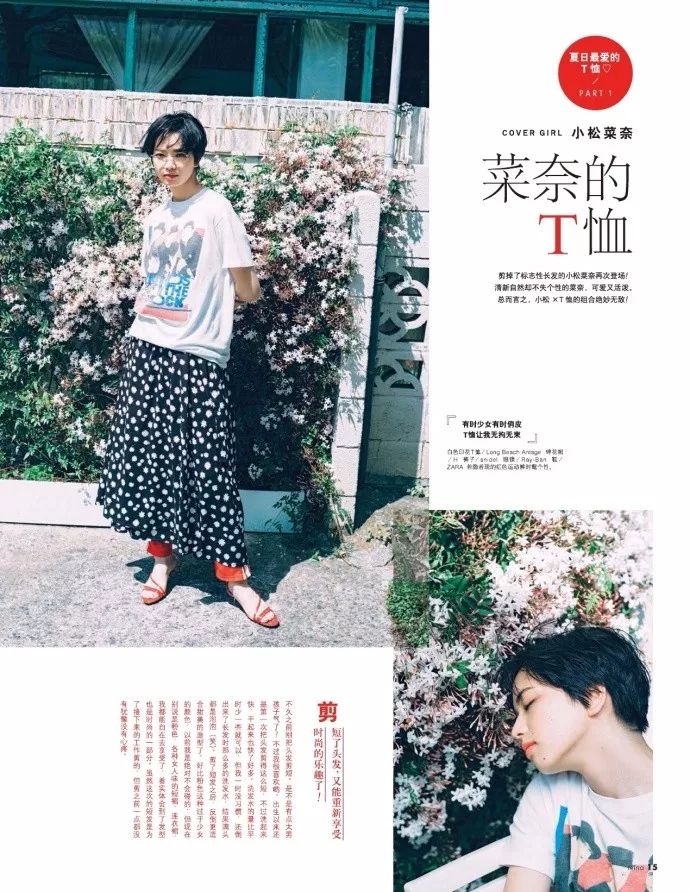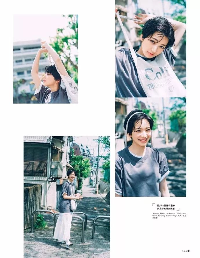 短发的nana特别帅气,简单的单品和巧妙的混搭,让她有了脱胎换骨的变换。T恤作为夏日必备的单品,也能通过叠穿展示多样性。如果嫌短发T恤太男性化,加一件长裙也意外地有可爱的少女感。